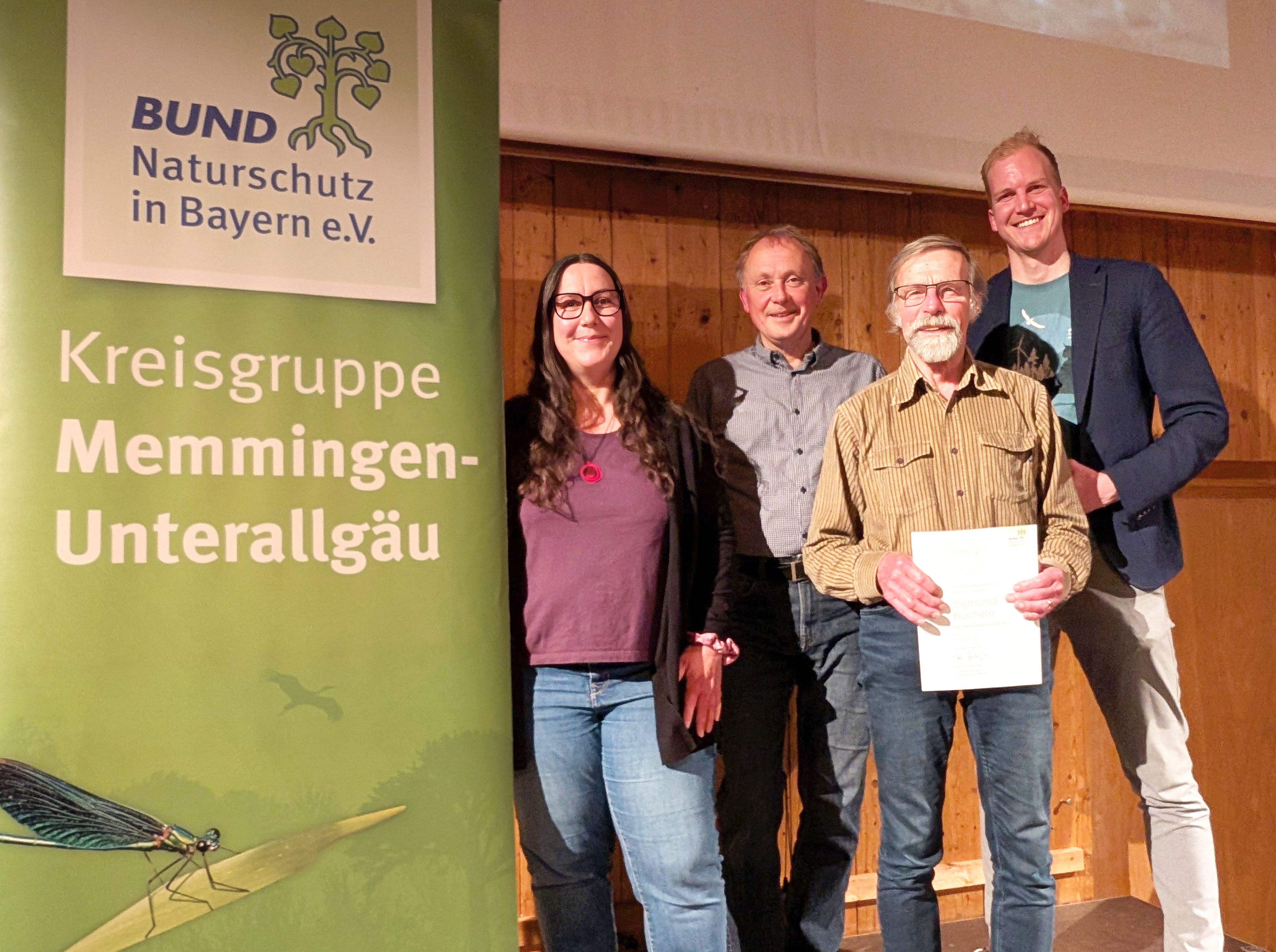 Für 50 Jahre Mitgliedschaft wurde Sigi Büchele mit der goldenen Ehrennadel geehrt. Bekannt ist er durch sein jahrelanges Engagement in der Ortsgruppe Memmingen: Als langjähriger Vorsitzender, als Macher, als Biotop-Betreuer mit Kettensäge, Rechen und wenn nötig sogar Sprengung. Herzlichen Dank für das Engagement und die kurzweiligen Anekdoten am Abend!