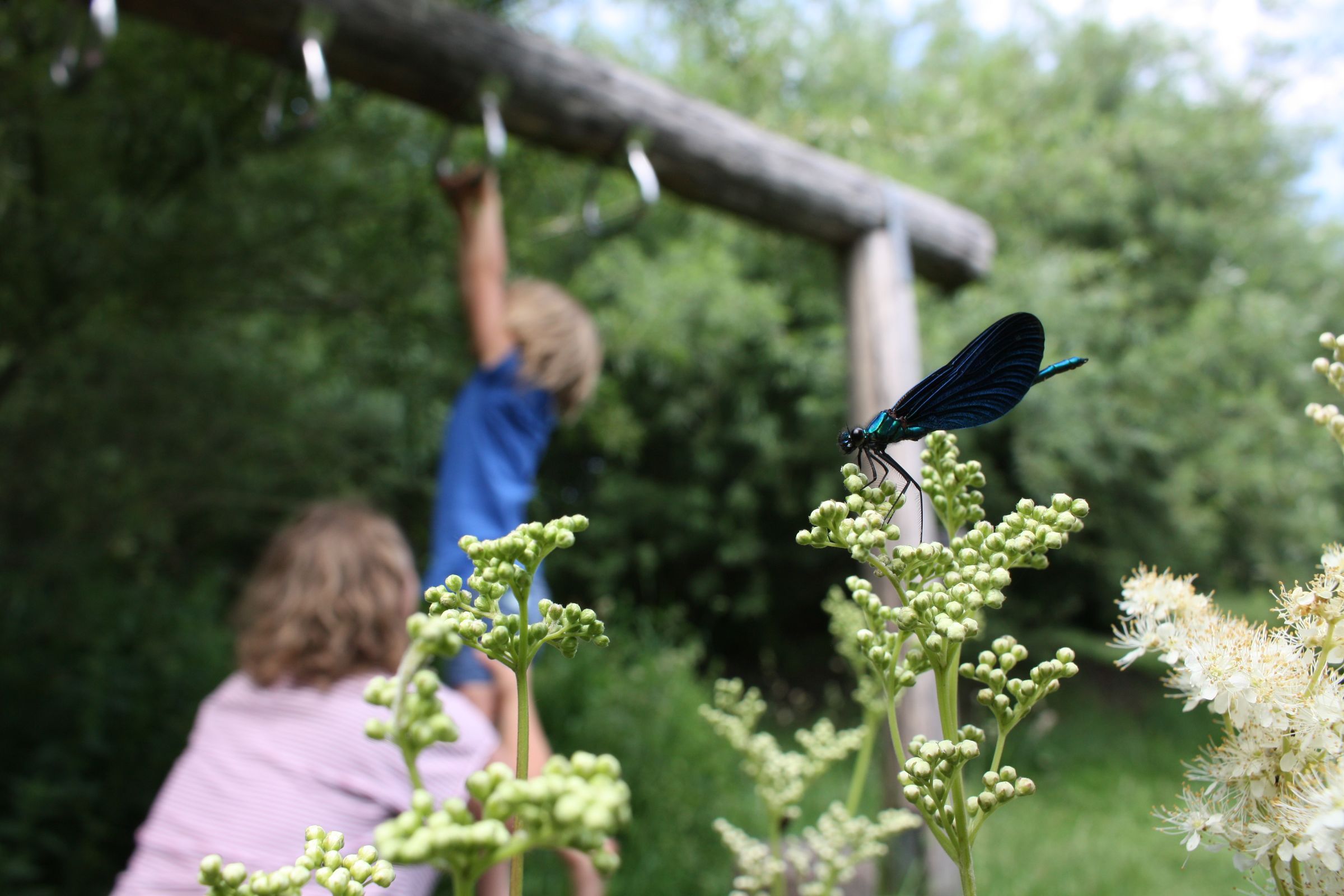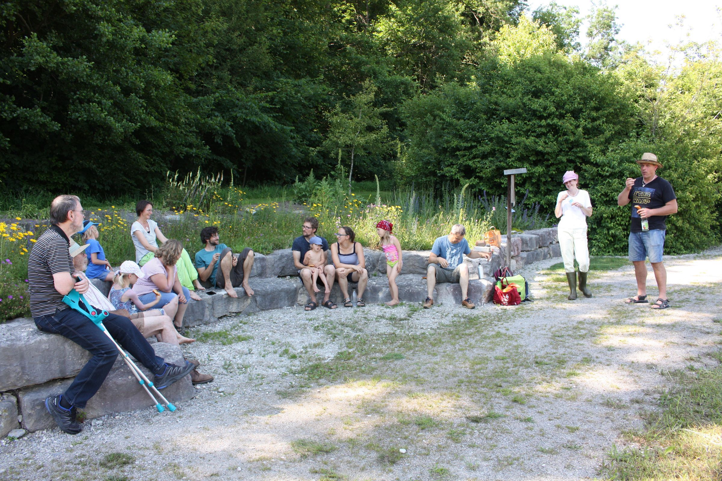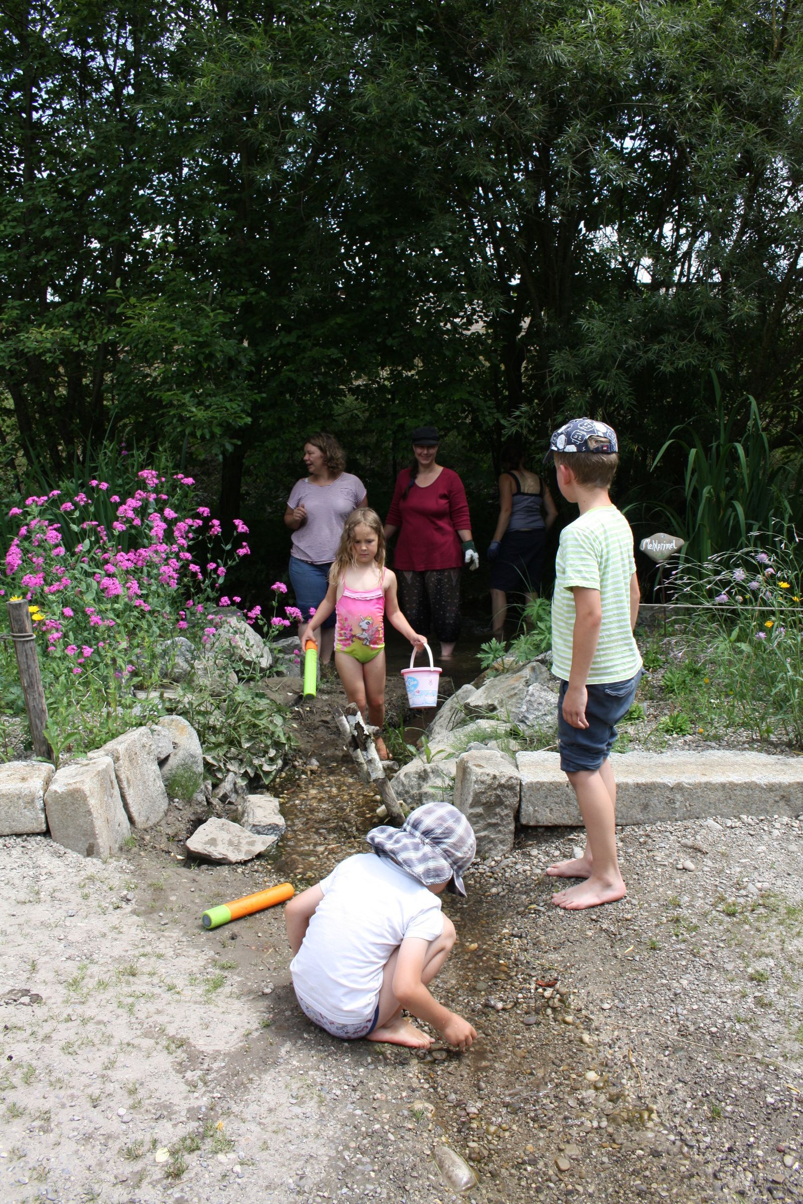 Vor allem entlang des Baches waren viele fleißige Hände aktiv. Die einen suchten akribisch nach dem noch jungen, invasiven Springkraut und schnitten Schwertlilien und Grassoden zurück, um der Verlandung vorzubeugen. Andere konnten eine Sitzbank aus dem Wasser bergen, während viel kleinere, aber mindestens genauso fleißige Hände in Matschrinnen Bäche erspringen ließen, Libellen hinterhereilten und aus Steinen kleine Wasserburgen bauten.