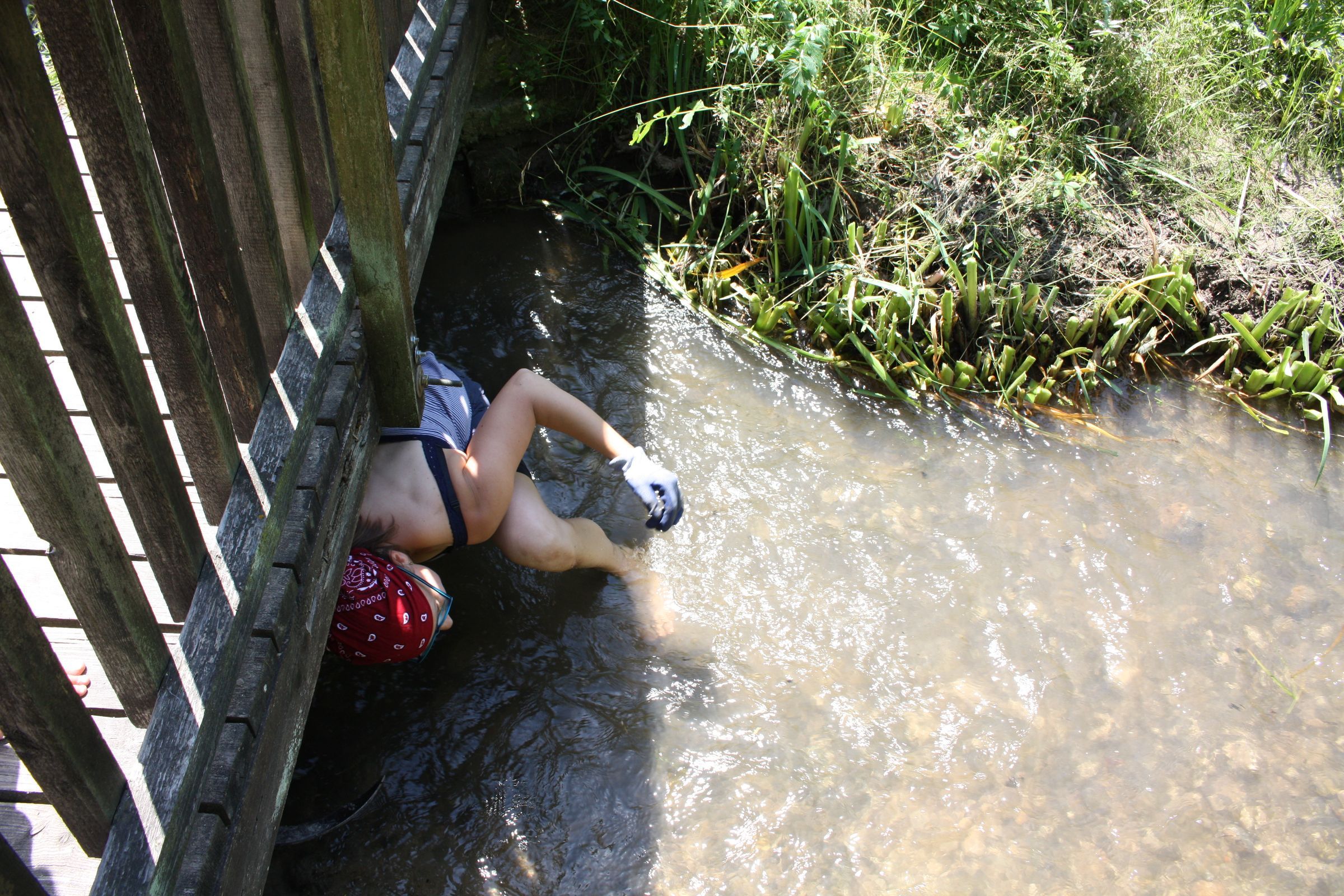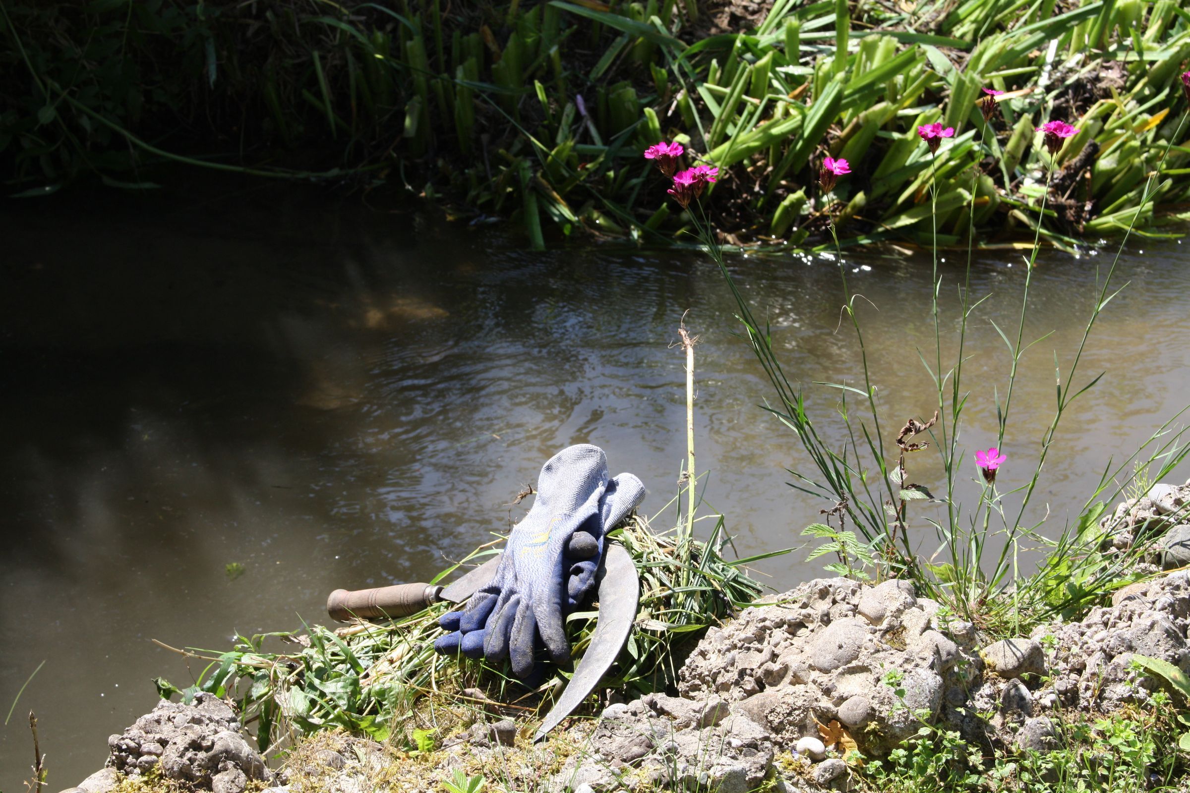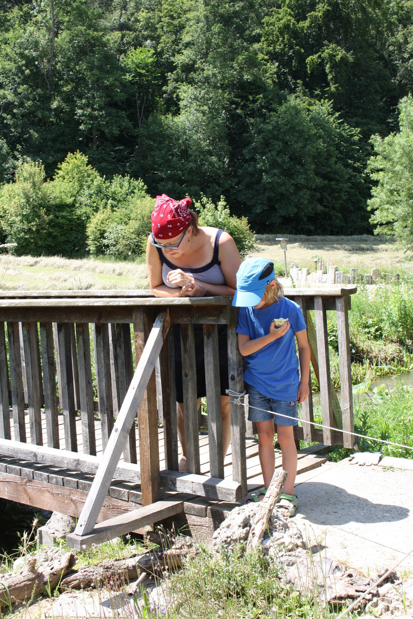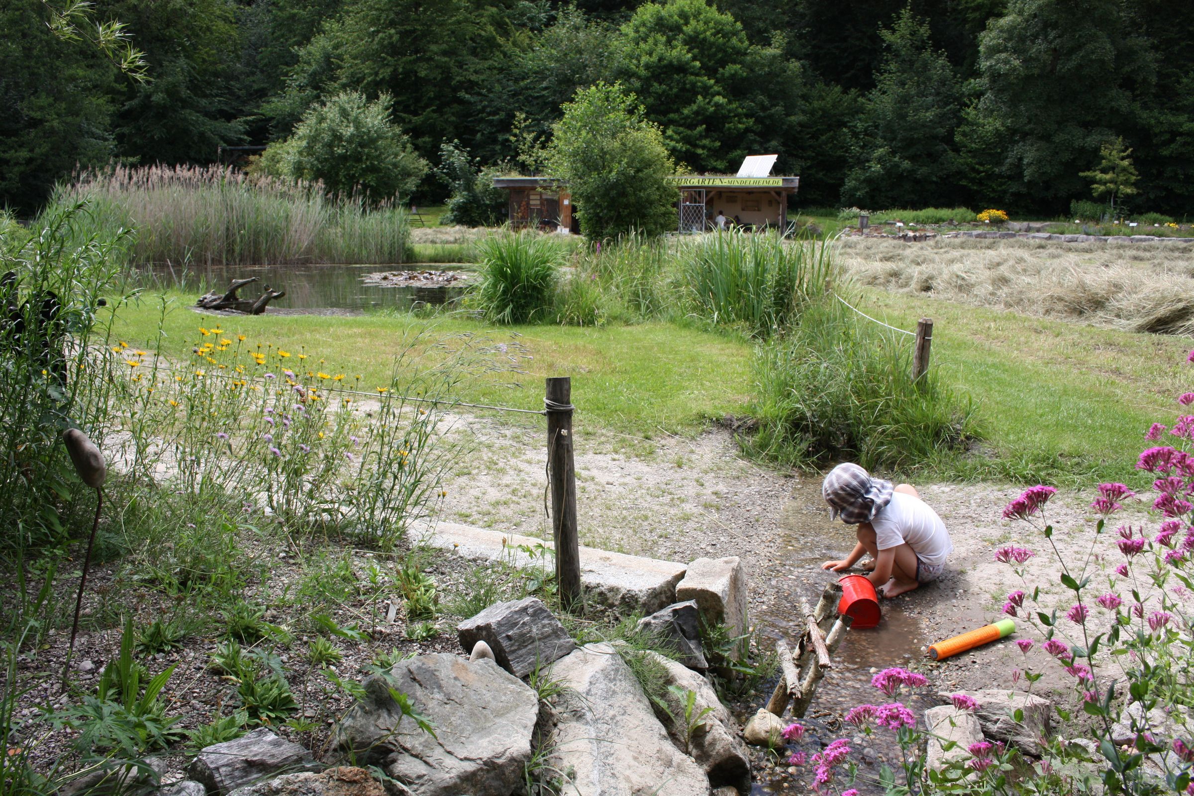 Vor allem entlang des Baches waren viele fleißige Hände aktiv. Die einen suchten akribisch nach dem noch jungen, invasiven Springkraut und schnitten Schwertlilien und Grassoden zurück, um der Verlandung vorzubeugen. Andere konnten eine Sitzbank aus dem Wasser bergen, während viel kleinere, aber mindestens genauso fleißige Hände in Matschrinnen Bäche erspringen ließen, Libellen hinterhereilten und aus Steinen kleine Wasserburgen bauten.