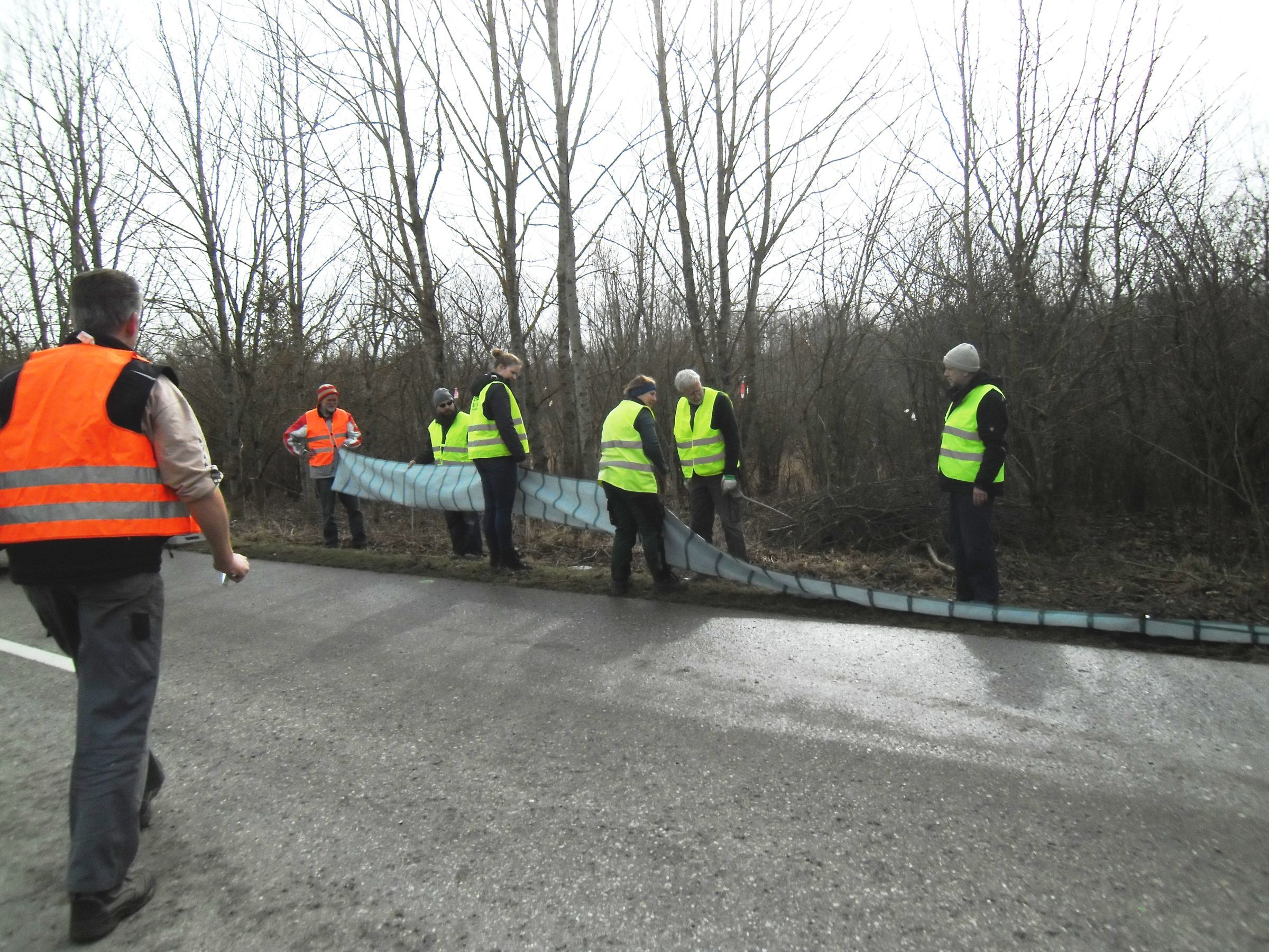 Und wieder einmal traf sich eine große Schar an Helfern, um an der Hartstraße in Irsingen Sperrzäune anzubringen, die verhindern sollen, dass Kröten, Frösche und Molche sich der Gerfahr aussetzen, beim Überqueren der Straße getötet zu werden. Dank der vorbildlichen Vorarbeit der Organisatoren Manfred Harzenetter und Karl Albrecht konnte der Aufbau der beiden Zäune in viereinhalb Stunden bewerkstelligt werden. Dabei wurden auf beiden Straßenseiten auf einer Länge von 450 Metern für die Hin- und Rückwanderer Fangzäune aufgestellt. Ab sofort werden morgens und abends engagierte Ehrenamtliche unterwegs sein, um die Amphibien auf die andere Straßenseite zu tragen.