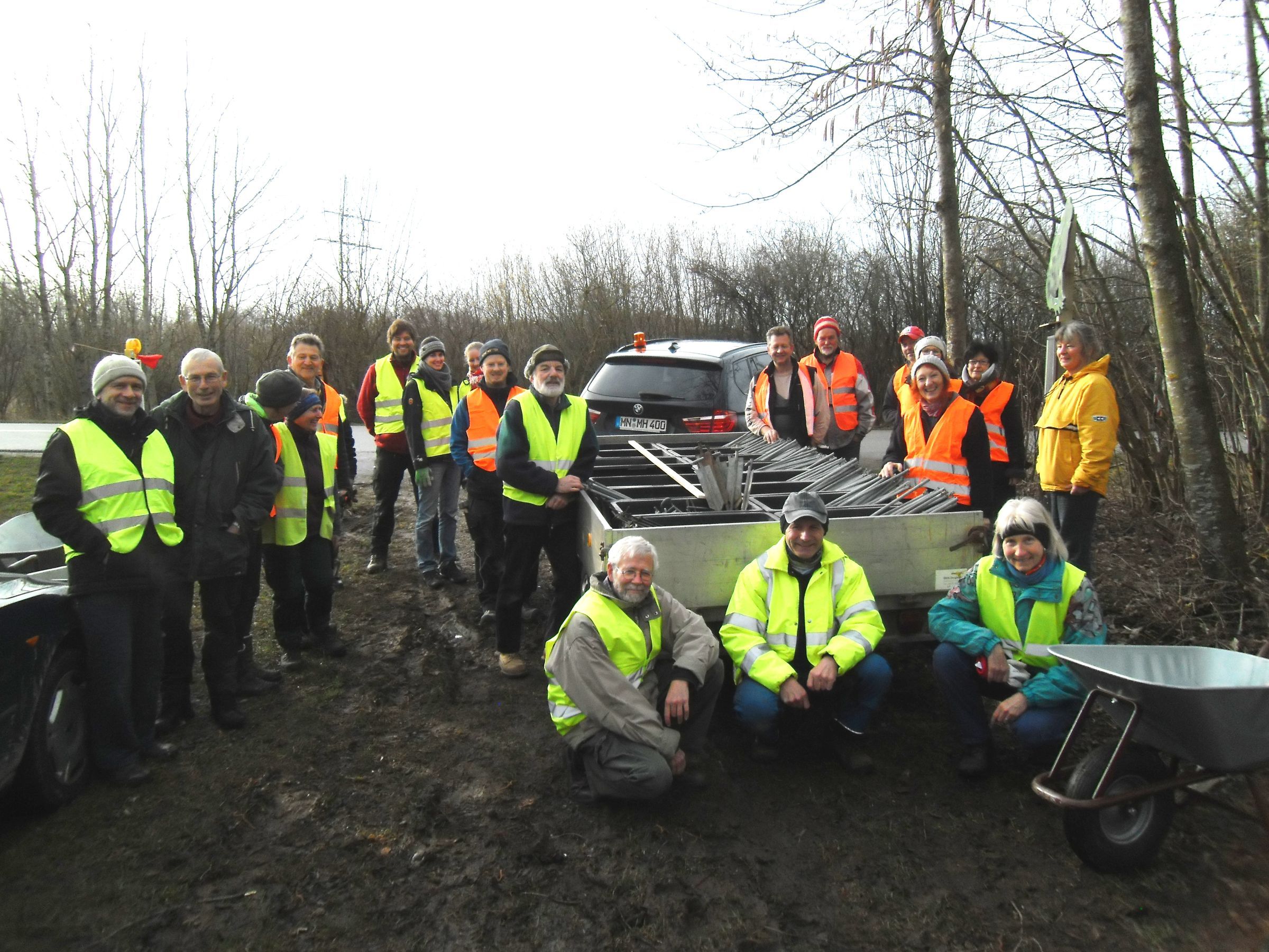 Wie schon in den letzten Jahren wurden an der Irsinger Hartstraße Fangzäune für den erwarteten Amphibienzug angebracht. Routiniert hämmerten die gut 15 Helferinnen und Helfer Befestigungsstangen und Haltenägel in den Boden. Dank der wiederum hervorragenden Vorbereitung von Michael und Manfred verlief der Aufbau wie am Schnürchen. Obwohl sich einige Unterstützer krankheitsbedingt abgemeldet hatten, schafften es die verbliebenen Helfer in gut drei Stunden ihre Werk zu vollenden. Leider hielten sich einige Autofahrer trotz ausgeschilderter Geschwindigkeitsbegrenzung nicht an das verordnete Tempolimit, was die Arbeit an den Zäunen doch in gewisser Weise erschwerte.