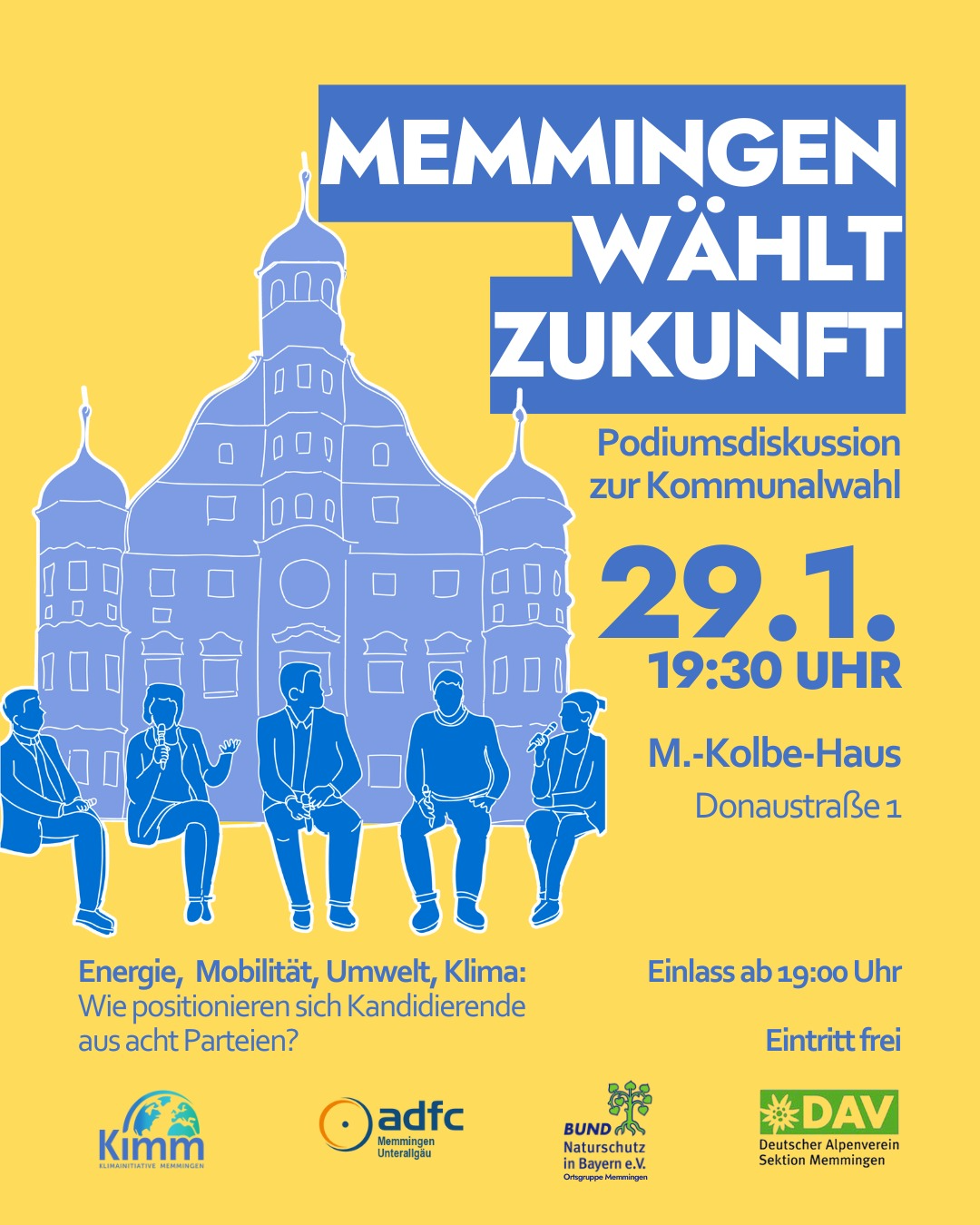 Im Frühjahr 2026 steht mit der Kommunalwahl eine wichtige Entscheidung für die zukünftige Entwicklung von Memmingen an. Daher hat die Ortsgruppe Memmingen des BUND Naturschutz zusammen mit DAV, ADFC und KIMM e.V. eine Podiumsdiskussion unter dem Motto “Memmingen wählt Zukunft” organisiert.