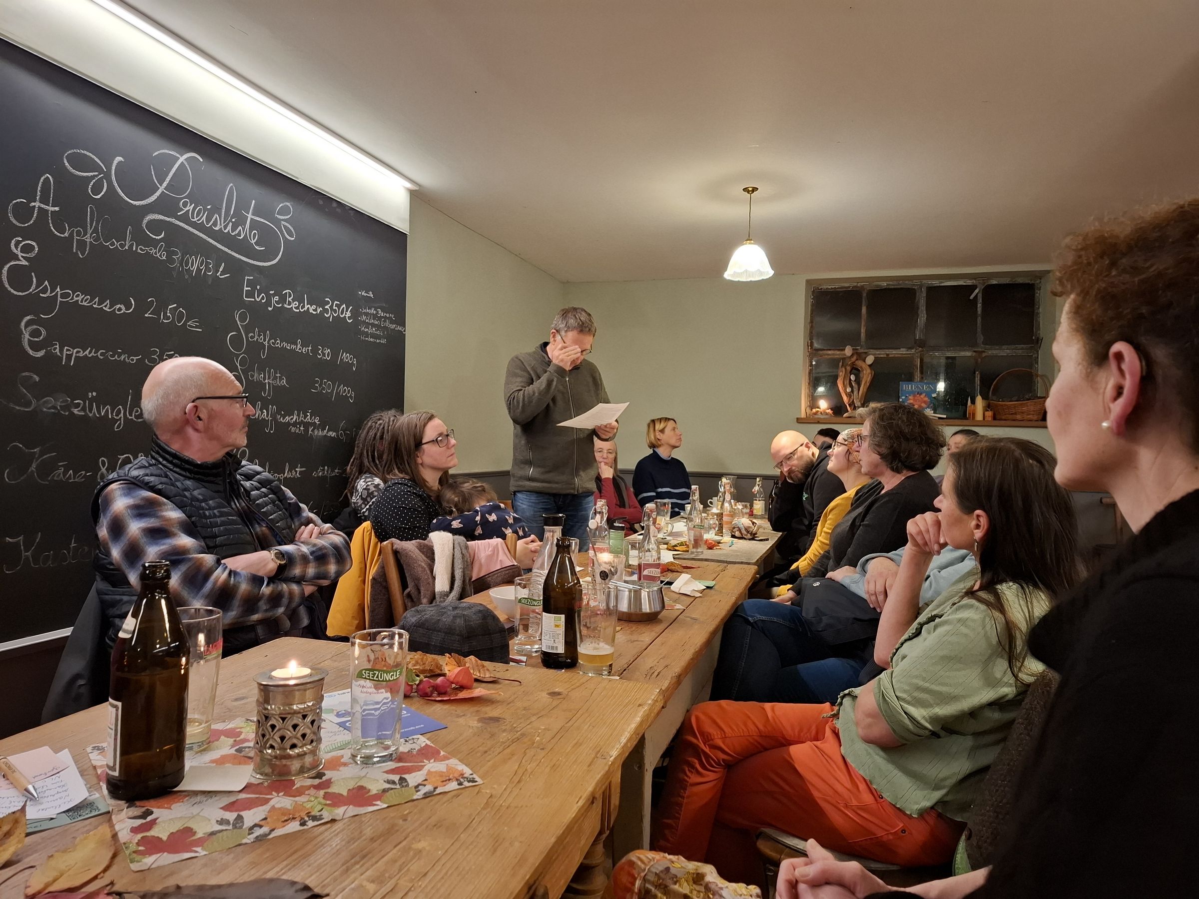 Der Biohof bietet an dem Abend Kürbissuppe mit Kartoffeln und Brot & optional Würstchen aus dem eigenen Demeter Betrieb zum Verzehr an.